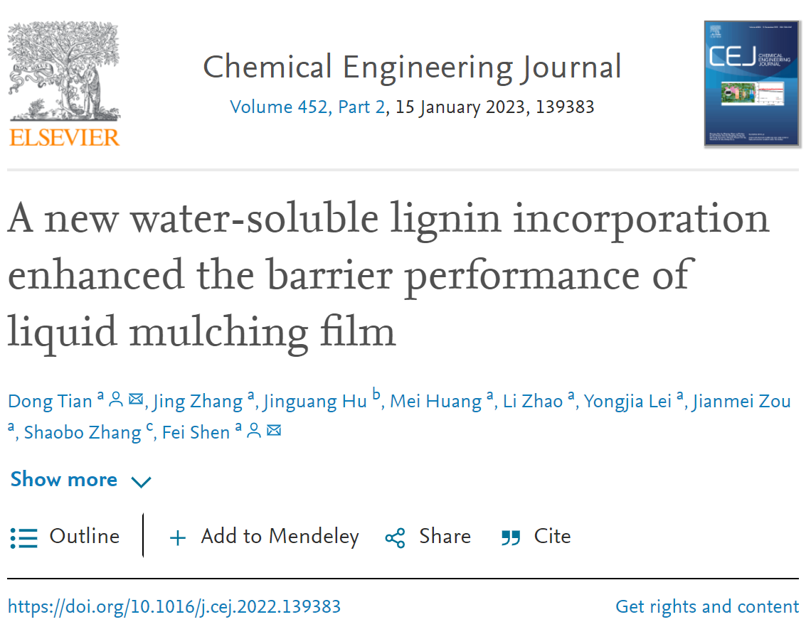 近日,环境学院农业废弃物处理与资源化团队研究论文“A new water-soluble lignin incorporation enhanced the barrier performance of liquid mulching film(一种新型水溶性木质素增强液体地膜的阻隔性能研究) 在国际知名期刊Chemical Engineering Journal(中科院1top, IF=16.744)发表,田东副教授为第一作者,田东副教授沈飞教授为通讯作者2020级硕士研究生张靖做出重要贡献。研究受到了国家自然科学基金(21978183)和四川省科技厅重点研发计划的资助(2022YFN00272021ZYD0099)。