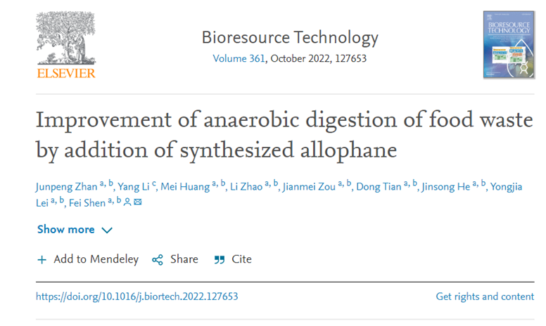 近日,环境学院沈飞教授团队研究论文“Improvement of anaerobic digestion of food waste by addition of synthesized allophane”在国际知名期刊Bioresource Technology(中科院1区top, IF=11.889)发表,该文由团队成员詹骏鹏为第一作者,沈飞教授为通讯作者。