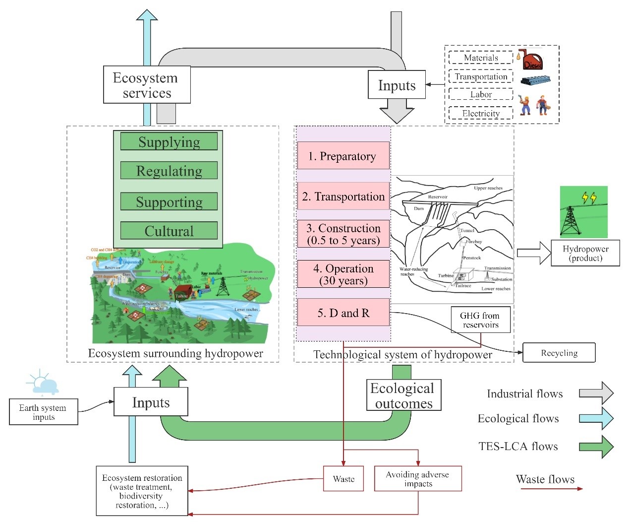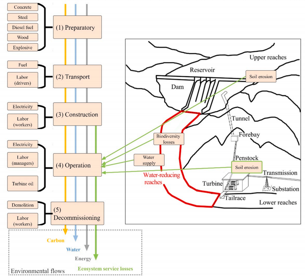 水电是四川省主要电力能源供给,在2010年以前,水电一直作为绿电的代表,在四川省各流域上大力开发。然而,现有研究表明,水电站在建设过程中会投入大量的材料、能源、劳动力,运营过程中会产生占地对植被的破坏、蓄水后大坝对河道的阻隔、减水河段生物多样性丧失等,这些潜在的投入和生态环境影响都加剧了公众对水电站作为绿电的质疑。今年夏季发生极端高温天气,四川省电力出现短缺,根据《四川省十四五电力发展规划》,到2025年,四川省水电装机容量还要再增加26.5%,这意味着还要建设大量的水电站。因此,如何权衡流域水电开发、保证电力生产、水电站的生态环境影响已成为当前环境管理领域内的研究热点。