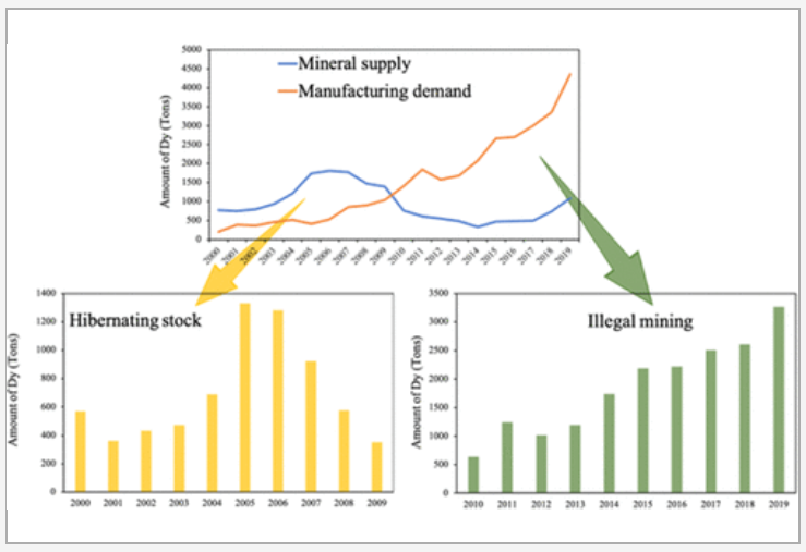 此外,团队的潘恒宇讲师与上海交通大学合作在环境领域顶级期刊《Environmental Science & Technology》发表了题为“Uncovering the Key Features of Dysprosium Flows and Stocks in China”(我国镝流量和存量的关键特征研究),该研究以tyc5997太阳集团为第二完成单位,潘恒宇为第三作者,研究采用动态物质流分析追踪 2000 年至 2019 年期间中国的镝循环,揭示了我国稀土元素的储备、流通过程,为我国在贸易战中合理控制稀土元素开发、优化提供了理论基础。