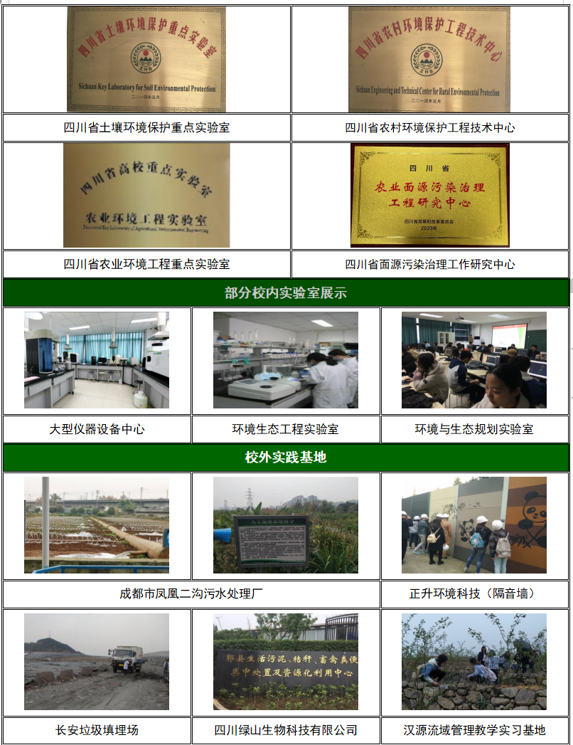 学院现拥有“四川省土壤环境保护重点实验室”、“四川省农业环境工程重点实验室”和“四川省农村环境保护工程技术中心”三个省级研究平台。其中“四川省土壤环境保护重点实验室”、环境生态工程实验室、环境与生态规划实验室、环境材料研究室、环境生态风险评估研究室、生态学综合实验室、环境法医及损害鉴定评估研究室、以及校级实践教学基地多处服务于本科教学及科技开发。