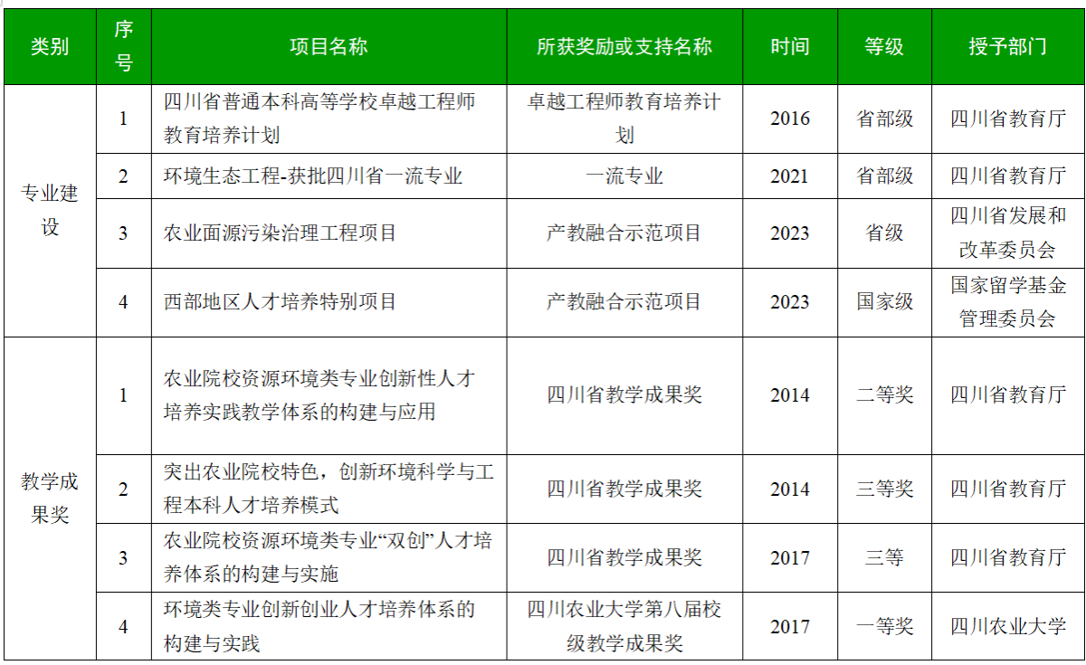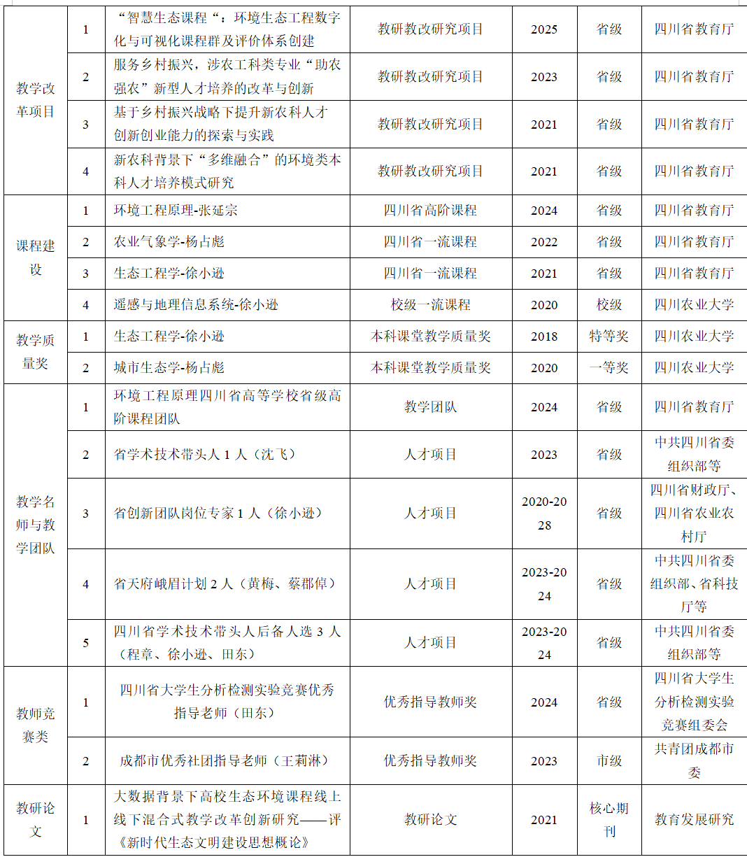 环境生态工程系负责《环境工程原理》、《生态与环境规划》、《环境生态工程》、《环境信息系统》、《流域生态工程设计》、《土建工程制图》、《建设工程概预算》、《生态监测与评价》、《生态工程》、《农业气象学》、《气象学与气候学》等20余门课程建设,其中《生态工程学》、《农业气象学》为四川省一流课程;《环境工程原理》为四川省级高阶课程。